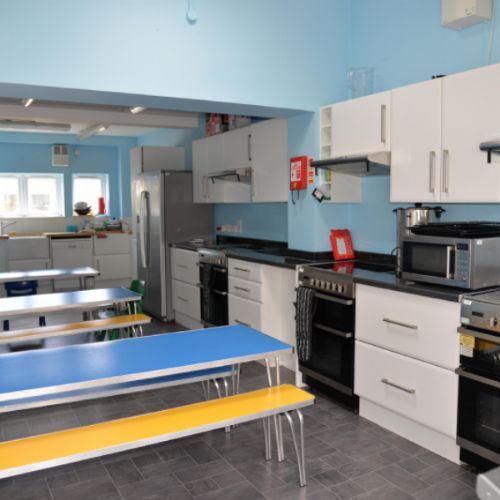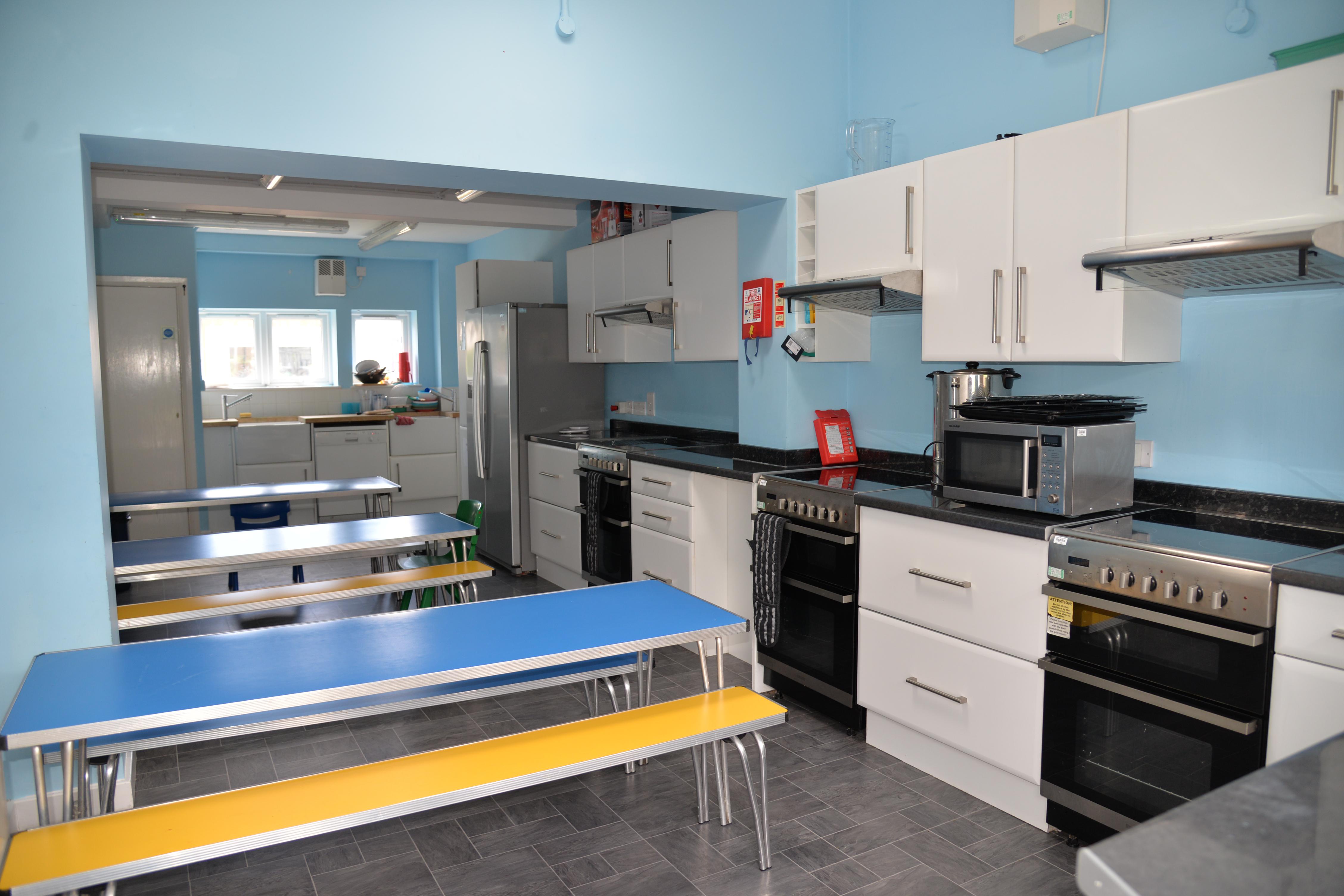 - Large kitchen with 3 hobs & ovens, microwave, hot water urn, sink (hot & cold drinking water), temporary fridge and freezer space. Range of kitchen utensils and cutlery.